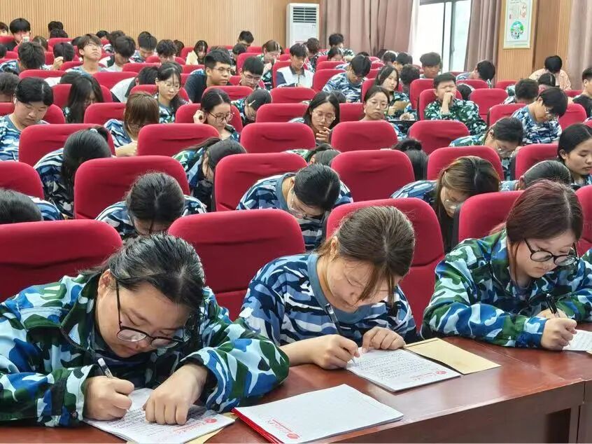活动尾声,一段由新生家长提前录制的祝愿视频引发全场共鸣。视频中,家长们的叮嘱与期盼、牵挂与鼓励,让新生们湿润了眼眶。随后的20分钟里,新生们纷纷提笔,在信纸上写下对父母的感谢与承诺,字里行间满是真挚与成长。随后,这些书信将邮寄给遍布在全国各地的爸爸妈妈们,汇报2025级同学们在入学教育和军训的收获和成长。