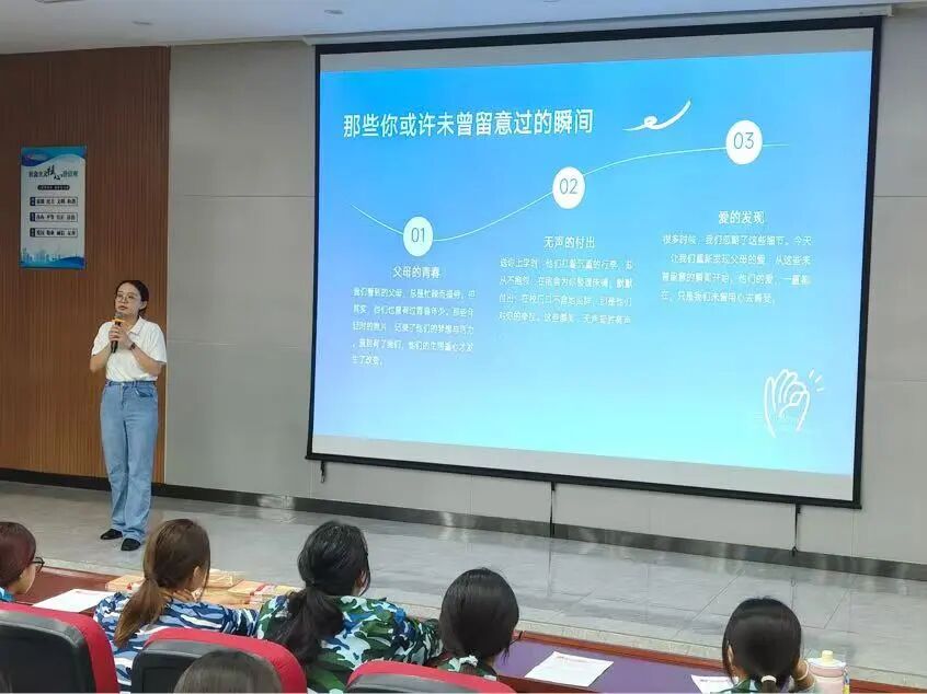 活动围绕四大核心环节展开,层层递进引导新生深化感恩认知。一是“相聚回望”,老师结合校园生活片段,带领新生回顾从离家报到到军训集结的点滴,唤醒大家对家人陪伴与付出的记忆;二是“计算反思”,通过“算一算父母为自己付出的时间与精力”互动,让新生直观感受亲情重量,反思日常与家人的沟通状态;三是“行动表达”,现场发起“感恩微行动21天挑战计划”,倡导新生坚持每天给父母发送一条消息,分享军训趣事与校园生活,将感恩融入日常;四是“写信诉情”,为新生提供信纸与信封,鼓励大家以手写书信的方式,沉淀内心话语,向家人传递深藏的情感。