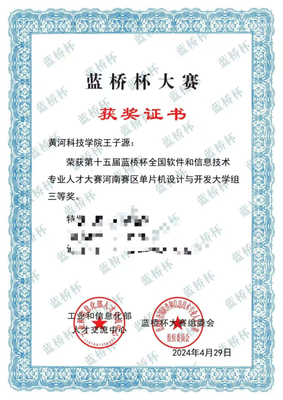 2024年04月荣获蓝桥杯全国软件和信息技术专业人才大赛三等奖;