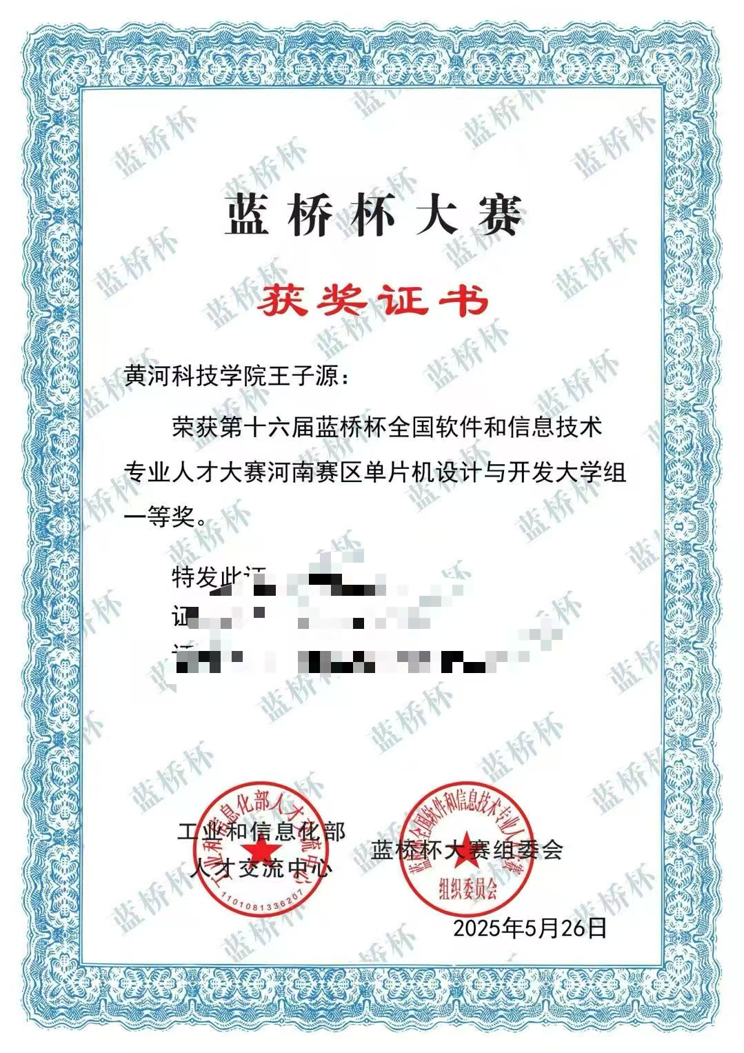 2025年05月荣获蓝桥杯全国软件和信息技术专业人才大赛一等奖;