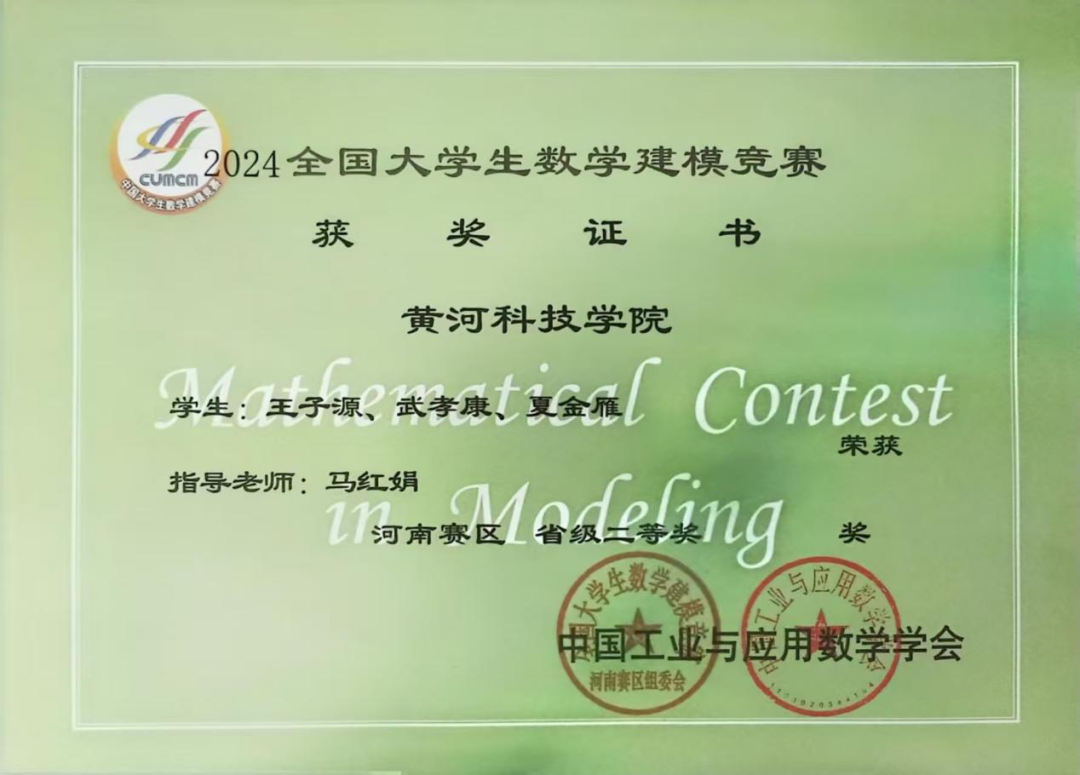 2024年11月荣获全国大学生数学建模竞赛二等奖;